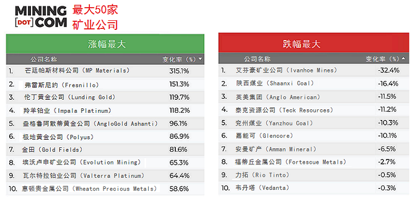 不出所料,漲幅最高的榜單中貴金屬股占據主導地位,最新躋身50強的礦業公司大多數為貴金屬企業。